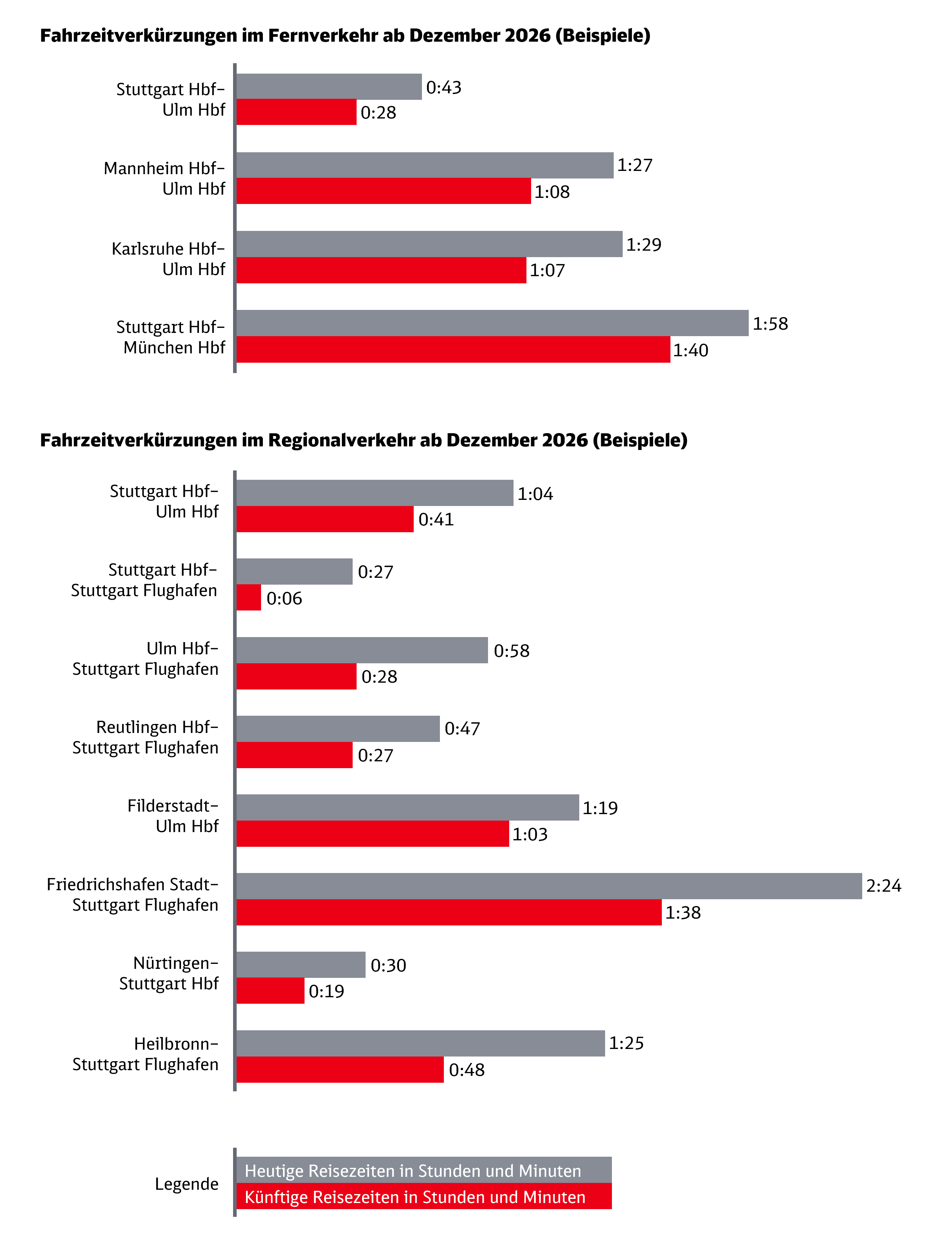 - Heilbronn–Stuttgart Flughafen: 48 Minuten statt heute 1 Stunde 25 Minuten (neue Direktverbindung)